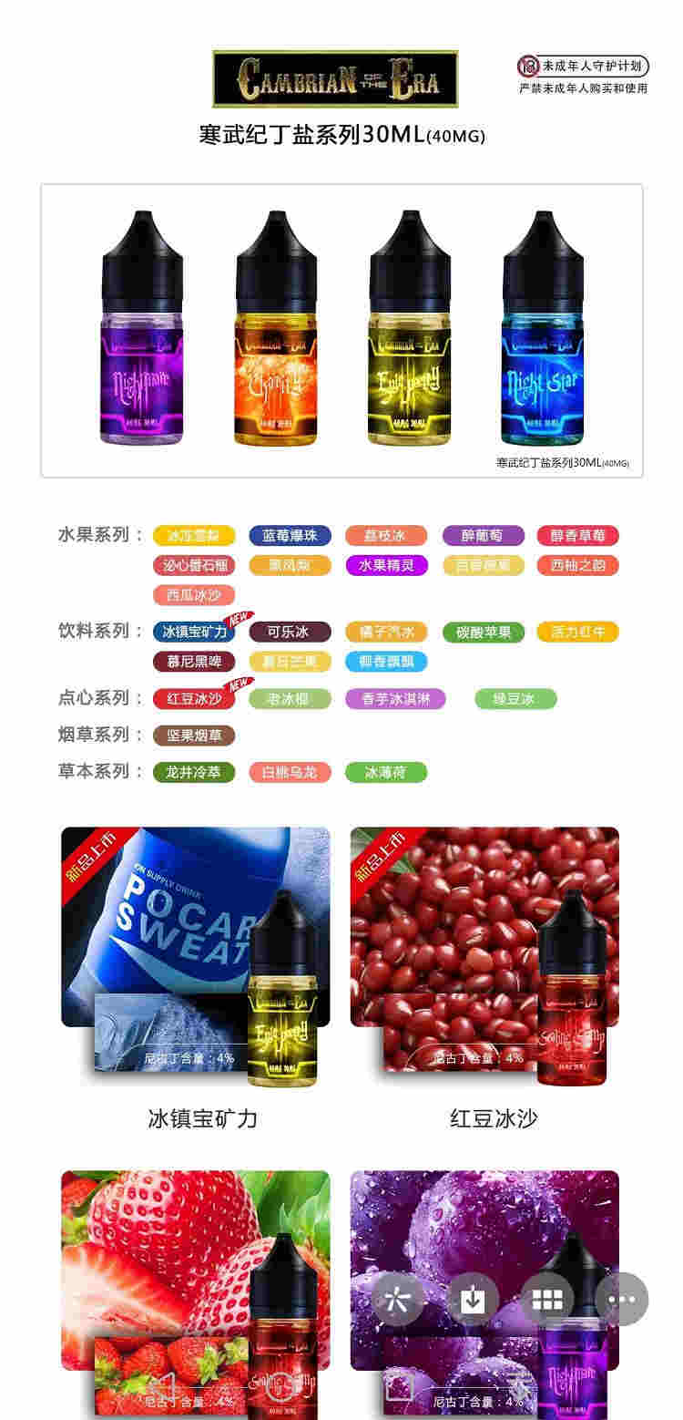 多種熱帶水果混合,奇妙搭配前味,中味,后味,各種水果味道輪番登場作為主導口味,芒果的清香,藍莓的憂郁,西瓜的爽口蘋果的清脆,荔枝的清甜,等等讓你口腔爆炸!尼古丁含量4%