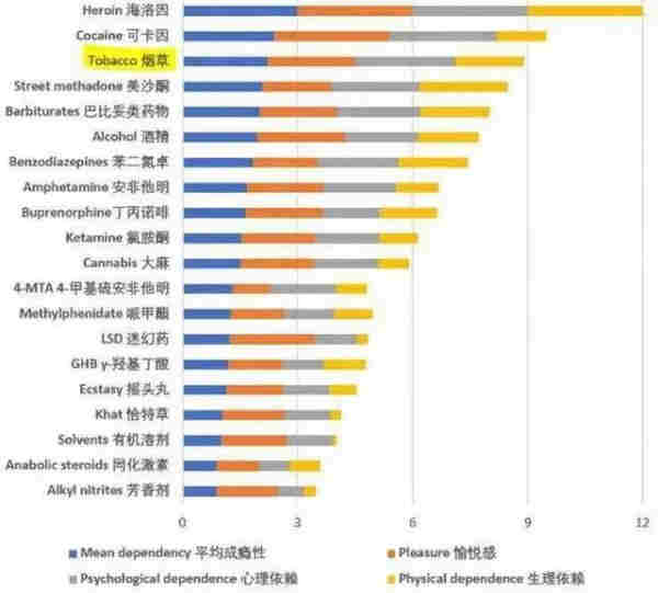 來自世衛組織的一份統計數據顯示,在所有致癮攝入品的名冊里,煙草和酒精的平均成癮性分別排在第三和第六,甚至高于一些被明令禁止的毒品。