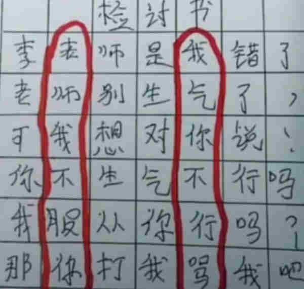 這位學生態度還算端正,而有的學生只是表面反省,內心還是不服氣的。于是將想法藏在“藏頭詩”里面。這位學生被老師懲罰以后,將每句話第一個字組成了“老師我討厭你”。