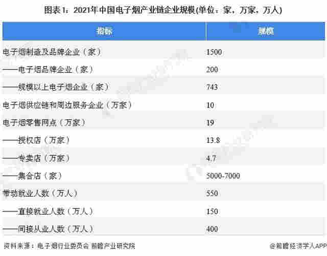 電子煙是指產生含煙堿(尼古丁)的氣溶膠供人抽吸的電子傳送產品。目前我國電子煙產業初具規模,根據《2021電子煙產業藍皮書》數據披露,當前國內電子煙制造及品牌企業超過1500家,電子煙供應鏈及周邊服務企業近10萬家,直接與間接帶動就業人數約550萬人。