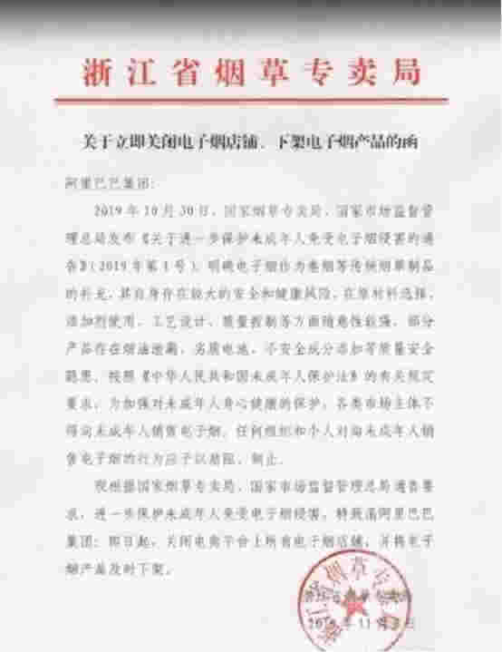 2019年11月1日,國家煙草專賣局、國家市場監督管理總局發布《關于進一步保護未成年人免受電子煙侵害的通告》(以下簡稱《通告》)指出,自《通告》印發之日起,敦促電子煙生產、銷售企業或個人及時關閉電子煙互聯網銷售網站或客戶端;敦促電商平臺及時關閉電子煙店鋪,并將電子煙產品及時下架;敦促電子煙生產、銷售企業或個人撤回通過互聯網發布的電子煙廣告。