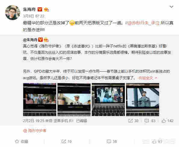 而翻看錘子科技產品經理朱海舟的微博,大家也會發現朱經理很活躍,一直在更新TNT系統的相關內容,也不時的點贊其他錘粉關于系統體驗方面的微博。截止到3月19日,朱海舟連續更新了五番“TNT系統細節集錦”,發布長文內容詳實,一點不像要人走茶涼的樣子。意外的是,筆者在翻看朱海舟TNT系統微博時還發現了一組的“追劇秀”,用來追劇的設備不是笨重的TNT工作站,而是一款輕便小巧的掌上電腦GPD Pocket 2。