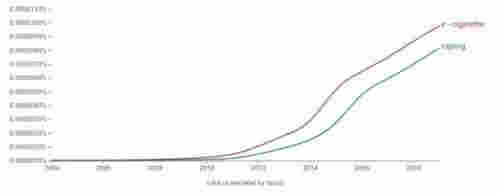 在搜索引擎中檢索電子煙的兩個英文名“vaping”和“e-cigarette”,可以看到自2010年開始,電子煙的網絡熱度便直線上升,到現在也沒有冷卻的跡象。