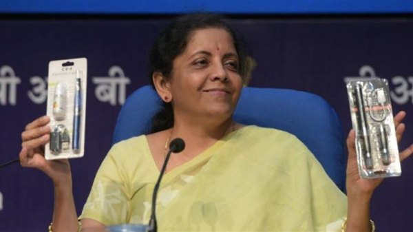 印度財政部長西塔拉曼在發布會上向媒體展示電子煙產品印度斯坦時報圖片