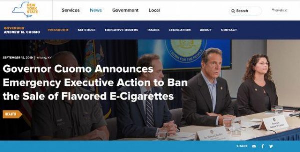 此后,9月15日,美國紐約州州長安德魯·科莫宣布了一項“緊急行政令”,在該州禁止銷售調味電子煙。紐約州長辦公室表示,行政令旨在相關立法出臺前,消除對未成年用戶的欺騙性電子煙營銷行為,并將電子煙的購買年齡從18歲提高到21歲。