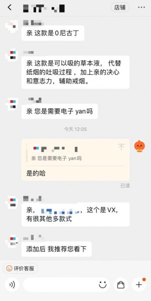又如在淘寶平臺,記者進入其中兩家標記文字為“戒煙神器”的店鋪,咨詢該產品是否為電子煙時,客服1側面回復稱:“168元包括一個桿子,6個液”“不含尼古丁,富含草本水果液的戒煙神器”;客服2回復為:“霧化器”“0尼古丁,代替紙煙的吐吸過程,加上親的決心和意志力,輔助戒煙”。