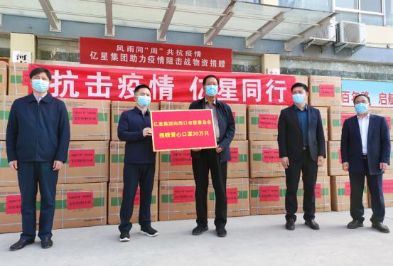 4月7日,為支援周口抗疫,保障民生需求,周口市電子商務協會黨支部所屬企業河南億星實業集團有限公司向周口慈善總會捐贈30萬只愛心口罩,踐行初心使命,彰顯責任擔當。目前,億星集團已向太康縣捐贈42噸民生物資,組織200余名工作人員連夜趕制2萬份蔬菜包,對奮戰在疫情防控一線的防疫人員進行慰問。