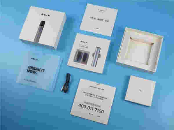 悅刻換彈霧化煙包裝盒采用揭蓋方案設計,打開包裝盒蓋子后可以看到一層透明磨砂材質隔頁覆蓋在產品上面,隔頁上印刷有產品LOGO和break it now文字標注,每個人閱讀都會有不同的含義。