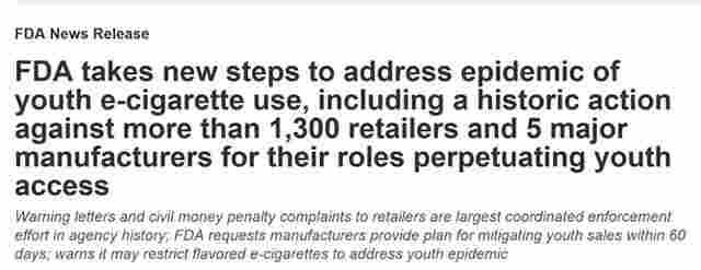 為解決這一問題,2018 年 9 月 12 日美國食品藥品管理局(FDA)宣布了一系列針對向青少年兒童銷售電子煙的嚴厲管制措施。在 FDA 有史以來最大規模的協調執法工作下,該局在美國全國范圍內對非法向未成年人銷售電子煙產品的零售商,發出了 1300 多封警告信和民事罰款投訴。