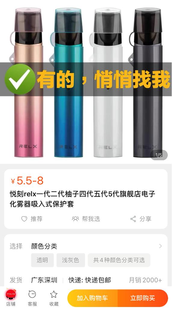 另一家店名為某柚子通配電子霧化器中,一款月銷顯示2000+的電子煙保護套產品,而在商品鏈接中,首圖展示的電子煙上,明晃晃配以“有的,悄悄找我”等指示性語言??头瑯釉谧詣踊貜椭兄苯颖硎尽皔彈,y桿都有貨”,并引導用戶添加