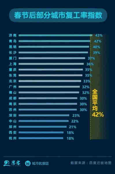 相比之下,深圳的復工要更艱難一些??梢詤⒖嫉臄祿?,百度遷徙地圖顯示,截至2月14日,全國平均復工率約為42%,而深圳的復工率僅為23%。