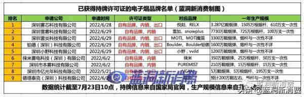 藍洞經過多方整理和打探,獲得了目前已經拿到持牌許可品牌的一年生產規模數據,以下數據除上市公司悅刻必須主動公開外,其余數據均非品牌官方發布,僅供業內參考。