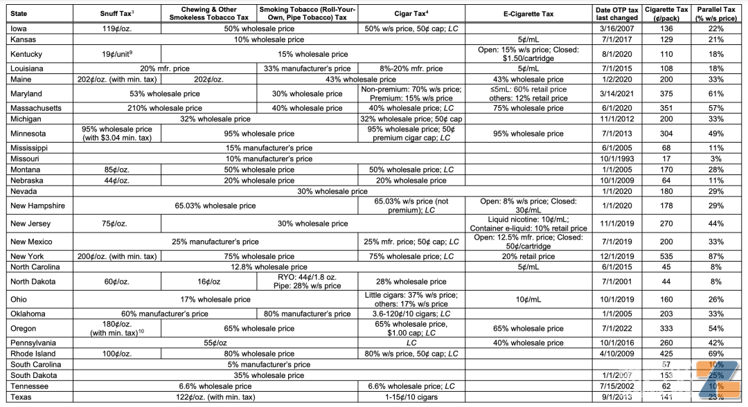 二十個州和哥倫比亞特區征收一定比例的價格稅,從佐治亞州的 7% 到明尼蘇達州的 95%。其中許多州將電子煙產品添加到該州對“其他煙草產品”的定義中,使它們有資格繳納該州現有的 OTP 稅。