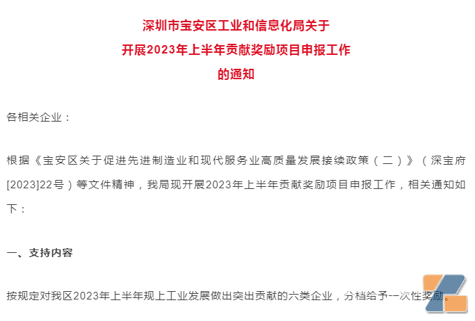 8月24日,深圳市寶安區工業和信息化局發布了《關于開展2023年上半年貢獻獎勵項目申報工作的通知》。通知稱,寶安區工業和信息化局現開展2023年上半年貢獻獎勵項目申報工作。