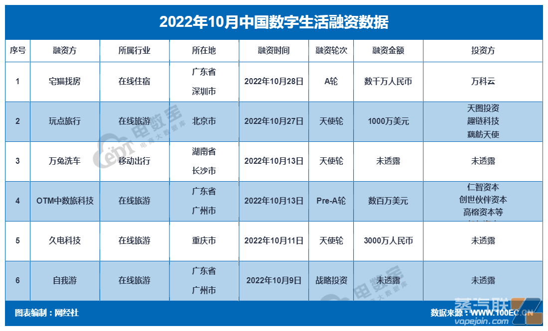 據網經社旗下電商大數據庫“電數寶”(DATA.100EC.CN)監測數據顯示,2022年10月數字生活領域共發生6起融資,融資方為宅貓找房、玩點旅行、萬兔洗車、OTM中數旅科技、久電科技、自我游,融資總額約1.3億元。