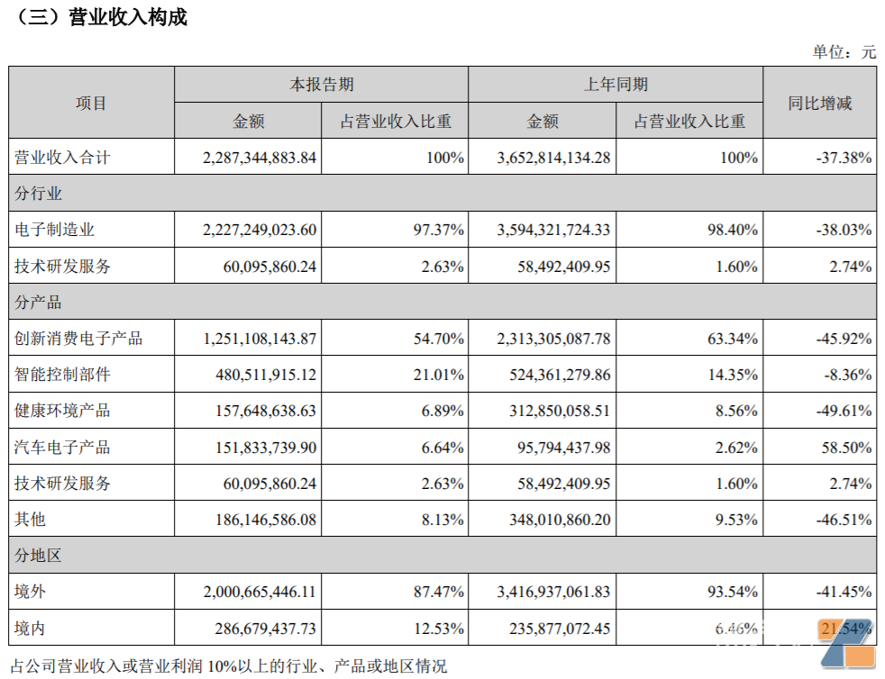 今年上半年,健康環境產品營收1.576億元,占比6.89%;汽車電子產品1.518億元,占比6.64%。