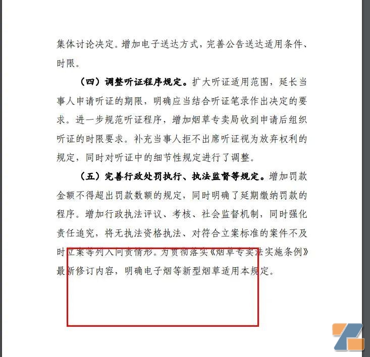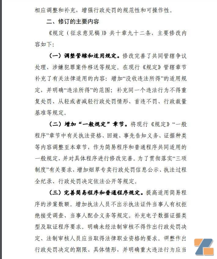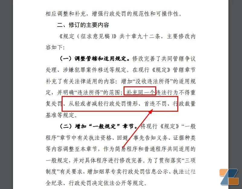 (電子煙處罰意見稿來了) 有什么亮點呢? 一、12月將有新的執法依據。 按照這份稿件提及,請于2022年12月5日前反饋意見。說明12月意見征求截止。 既然是征求意見,當然各位有意見可以先提。 這次也明確提到,修改法的必要性。特別提到,煙草專賣行政執法實踐中也出現了一些新情況、新問題,亟需作出相應調整和補充,增強行政處罰的規范性和可操作性。 而且還特別提到“最新修訂內容,明確電子煙等新型煙草適用本規定?!?/span> (適合電子煙) 二、首例不罰的原則,而且不得重復罰。 規定提到,增加“沒收違法所得”的適用規定,并明確“違法所得”的范圍;補充同一個違法行為不得重復處罰、從輕或者減輕行政處罰情形、首違不罰、行政裁量基準等規定。 (增加了修改) 三、什么情況可以拒絕檢查和處罰? 規定提到,處罰要出示證件。 規定提到,執法人員不出示執法證件的,當事人或者有關人員有權拒絕接受調查或者檢查。就是被查的時候,當事人或者有關人員有權要求執法人員出示執法證件。 增加執法人員不出示執法證件當事人有權拒絕接受調查、當事人配合義務等規定。 四、要協助函。 規定提到,協助函很重要,特別要查合同之類的。提到“執法人員需要從有關單位查閱、復制與違法活動有關的合同、發票、賬冊、單據、記錄、文件、業務函電和其他材料的,應當出示縣級以上煙草專賣局出具的協助函?!?/span> 而且明確“未經法制審核不得作出行政處罰決定、法制審核人員應當取得法律職業資格的要求?!?/span> 五、不能超過罰款金額。 這次,增加“罰款金額不得超出罰款數額的規定,同時明確了延期繳納罰款的程序”。 六、可以先行保存證據。 先行登記保存期間,任何人不得銷毀或者轉移先行登記保存的證據。 七、可以加收滯納金。 規定提到,到期不繳納罰款的,煙草專賣局可以每日按罰款數額的百分之三加處罰款,加處罰款的數額不得超出罰款的數額。 八、罰款還可以緩期,分期。 規定提到,當事人確有經濟困難,需要延期或者分期繳納罰款的,經當事人申請和煙草專賣局批準,可以暫緩或者分期繳納。 九、60天內可以復議。 規定提到,當事人對煙草專賣局作出的行政處罰決定不服的,可以自接到行政處罰決定書之日起六十日內,向其上一級煙草專賣局申請復議;當事人也可以自接到行政處罰決定書之日起十五日內直接向人民法院提起行政訴訟。 十、沒有法律依據的,不能處罰。 規定提到了,沒有法定的行政處罰依據的,都屬于違規執法。 此外,另外4個情形都是違規,如:擅自變更行政處罰種類、幅度的;違反法定的行政處罰程序的,違法委托其他單位或者個人實施行政處罰的;執法人員未取得執法證件的,都是違規。 (這四種處罰,是違規的) 下面是修改意見官方說明,請查看。 (修改意見文件說明)
