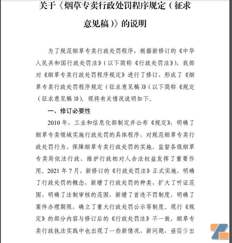 剛剛,一則關于《煙草專賣行政處罰程序規定(征求意見稿)》的說明,預計將為今后包括電子煙懲罰奠定了執法的依據。 文件是工信部下發。整整25頁,很長,92條。不管怎樣,執法和電子煙密切相關,各位電子煙行業從業人士,應該好好拜讀下。 點擊輸入圖片描述(最多30字)