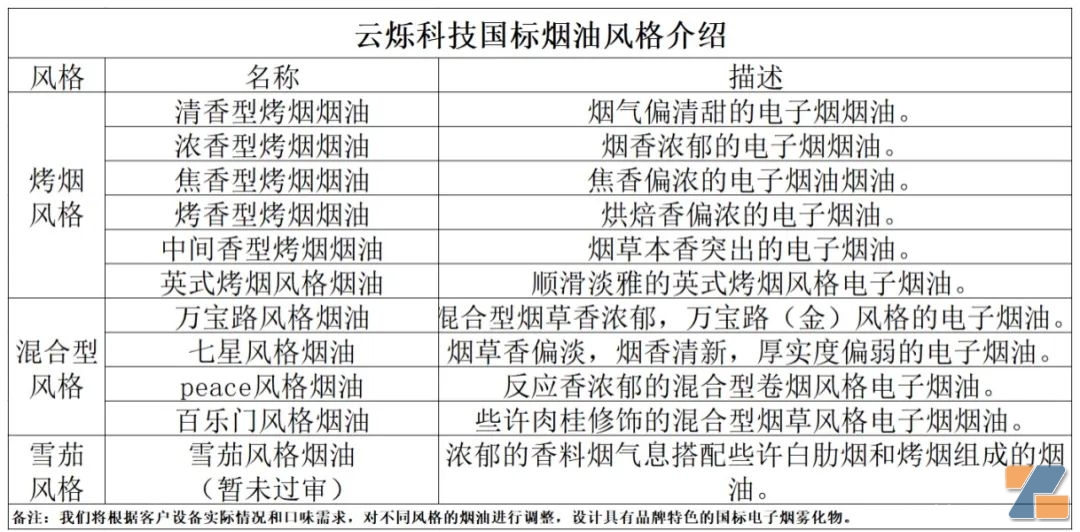 受制于各家煙油廠和品牌方對過審率的追求、對煙草口味的認知、原料庫中煙草提取物種類的儲備和對《電子煙國家標準GB41700-2022》中允許使用的霧化物添加劑的理解,調香師在設計煙草口味時添加的煙草提取物和添加劑種類缺少多樣化,導致市場上大部分煙草口味煙油香氣大同小異,沒有記憶點。 云爍科技基于傳統煙草多年積累,優選各地區優質煙草原料,初步開發出具有不同風格特色的電子煙專用煙草提取物二十余款,可搭配不同風格的煙草凈油、煙草揮發性提取物和多樣化的霧化物添加劑模塊,開發出香氣濃郁,口感細膩飽滿的國標煙油供客戶選擇。