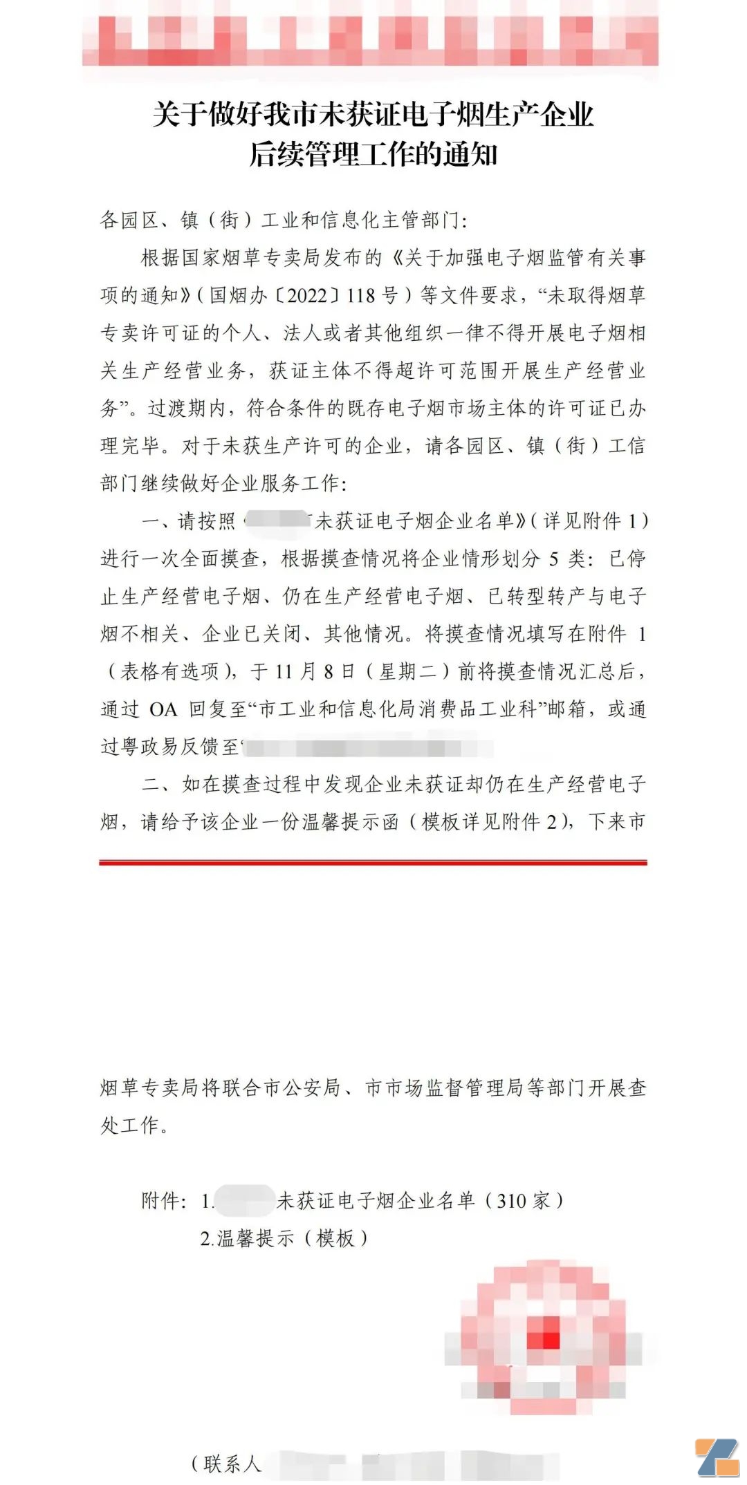 11月5日早間,一份名為《關于做好我市未獲證電子煙生產企業后續管理工作的通知》的文件開始在電子煙從業者之中傳播。文件顯示,這份通知來自東莞市工業和信息化局,主要內容為以下幾點: 1,明確過渡期內,符合條件的既存電子煙市場主體的許可證已辦理完畢; 2,按照通知中的附件《東莞市未獲證電子煙企業名單》對東莞市的電子煙相關企業進行一次全面摸查; 3,將摸查企業分位5類::已停止生產經營電子煙、仍在生產經營電子煙、已轉型轉產與電子煙不相關、企業已關閉、其他情況,并匯總。 4,如果摸查中發現企業未獲證卻仍在生產經營電子,給予該企業一份溫馨提示函,下來市煙草專賣局將聯合市公安局、市市場監督管理局等部門開展查處工作。