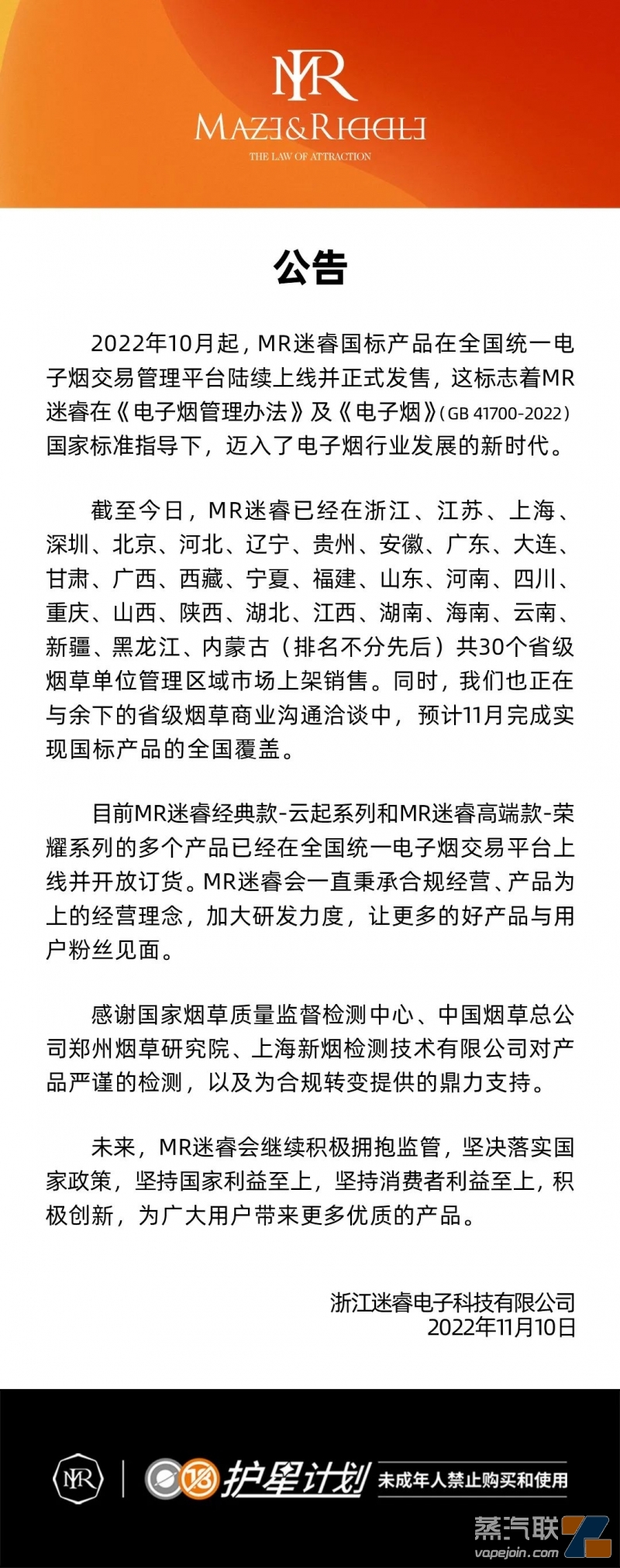 2022年10月起,MR迷睿國標產品在全國統一電子煙交易管理平臺陸續上線并正式發售,這標志著MR迷睿在《電子煙管理辦法》及《電子煙》(GB41700-2022)國家標準指導下,邁入了電子煙行業發展的新時代。