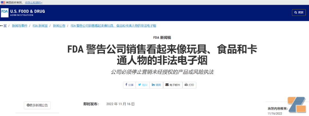 除了本次發出的警告信外,截至10月28日,FDA已向非法銷售含有煙草尼古丁電子煙的公司發出440多封警告信,向非法銷售含有非煙草尼古丁電子煙的公司發出60多封警告信。