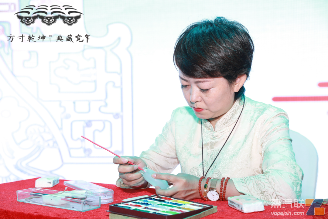 四川中煙新型煙草制品中心代表 現場對此次發布的寬窄鼻煙壺做了詳細介紹 并通過VR全息的科技方式 將產品在現場進行呈現 四川中煙三聯公司副總經理周志剛 與嬌子公司董事長羅雪雷 現場簽訂了寬窄鼻煙壺代理協議 中國鼻煙壺內畫學會成員、 成都市內畫非遺傳承人吳建英女士 現場作畫吸引了觀眾的目光和贊許 同時,現場還表彰了2022年度 鼻煙壺作品征集大賽的獲獎者
