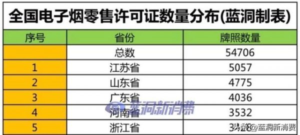從電子煙零售許可證規劃數量來看,廣東和浙江的排名均進入了全國前五,廣東(除深圳)的數量為4036張,排名第三,浙江的數量為3428張,排名第五。
