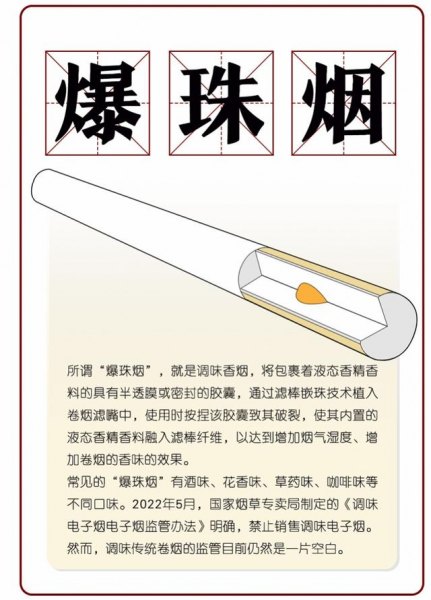 卷煙當中的調味產品主要就是爆珠煙。所謂“爆珠煙”,就是將包裹著液態香精香料的具有半透膜或密封的膠囊,通過濾棒嵌珠技術植入卷煙的濾嘴中,使用時按捏該膠囊致其破裂,使其內置的液態香精香料融入濾棒纖維,以達到增加煙氣濕度、增加卷煙的香味的效果。