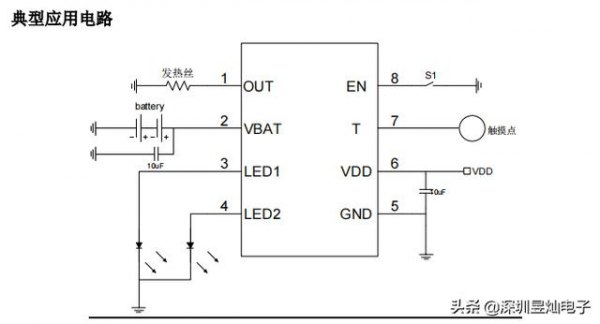 SM5101 是一款針對電子點煙器的專用芯片,具有完整的充電功能和完善的電池保護功能,還具有觸摸控制開關。SM5101 具有發熱絲短路保護功能,在負載電阻小于 0.8Ω 電阻時輸出截止。SM5101 還具有省電模式,在省電模式下靜態待機電流小于 1uA。SM5101 具有完善的電池保護功能,具有過流、過壓、恒流、恒壓、溫度保護等功能。當鋰電池充電電壓小于 2.7V 時為涓流充電,可以保證不損壞電池;當鋰電池電壓大于 2.7V 后,開始大電流恒流充電;當電壓接近 4.2V 時,充電電流逐步減小,充電電流小于一定閾值后,SM5101 就截止充電。充電電壓檢測誤差可以做到±1%。