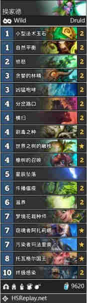 作為從加基森版本即出現的一套卡組,經過歷史的沉淀和打磨,形成了目前的構筑:以招募體系,單解和傳播瘟疫作為防御手段,青玉體系作為節奏核心,加之德魯伊在猛犸年獲取的大量優質單卡填充,形成了目前的可快可慢的青玉德。在對局之中,起手統一留橡樹的召喚和青玉綻放,在對戰快攻時尋找解牌和傳播瘟疫進行防守,對抗慢速時尋找生物和分岔路口不斷給以場面壓力伺機斬殺。同樣的,在面對依賴組合技的卡組時,機械拷問者也可以拖出對方的組件來起到破壞體系的作用。