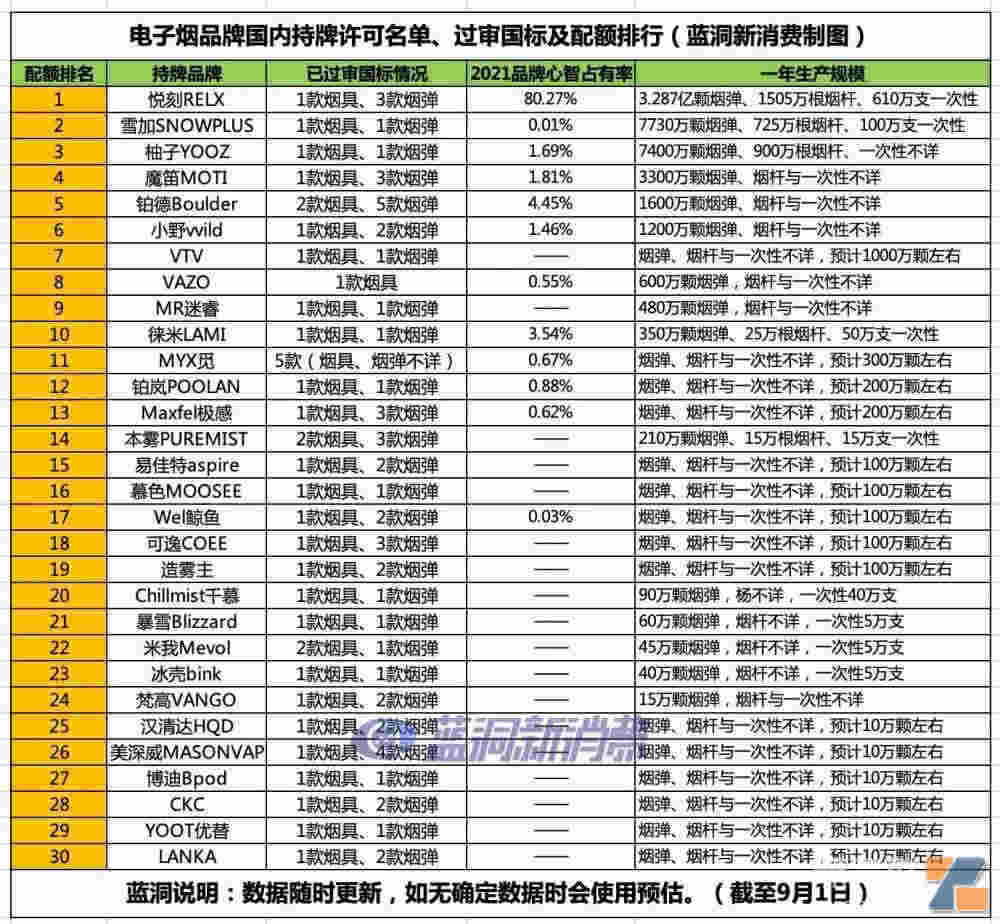 9月1日,根據藍洞今日整理匯總的數據顯示,截至目前,一共有30家電子煙品牌的產品通過了電子煙強制國標技術審評,意味著這些品牌的產品將可以通過全國統一電子煙交易管理平臺進行交易。